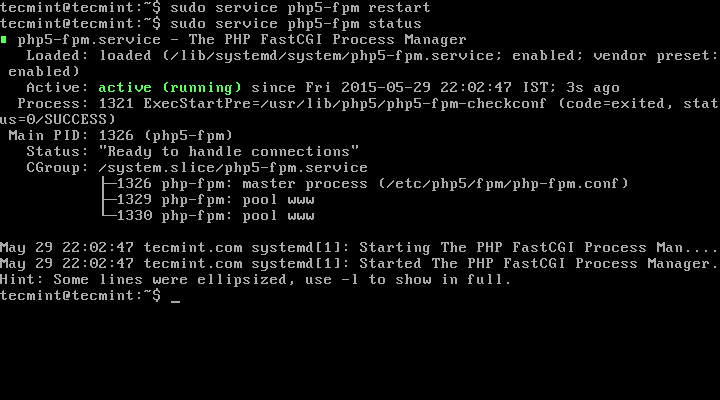 $ sudo service php5-fpm restart $ sudo service php5-fpm status