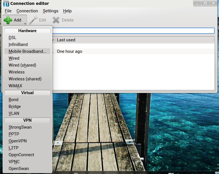 5. Click on Add –> Mobile Broadband from the connections editor.