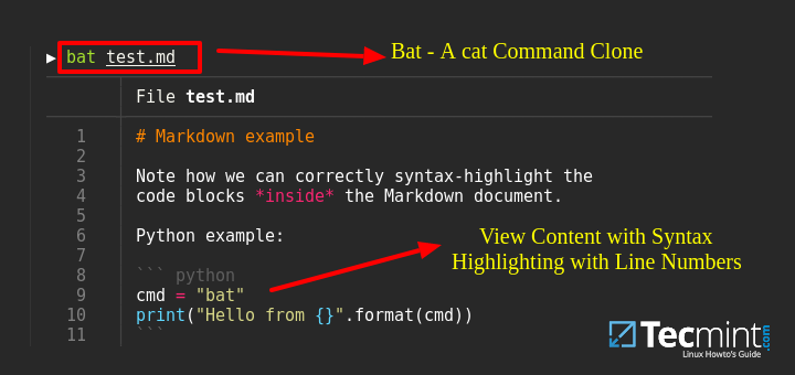 Bat is a cat command clone with advanced syntax highlighting for a large number of programming and markup languages and