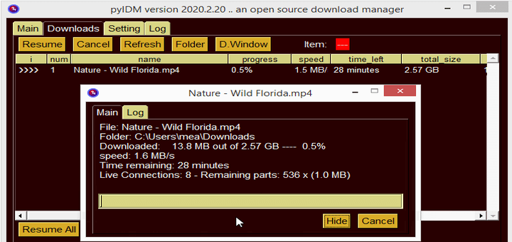 pyIDM is a free, open-source alternative to IDM (Internet Download Manager), used to download general files and videos from youtube