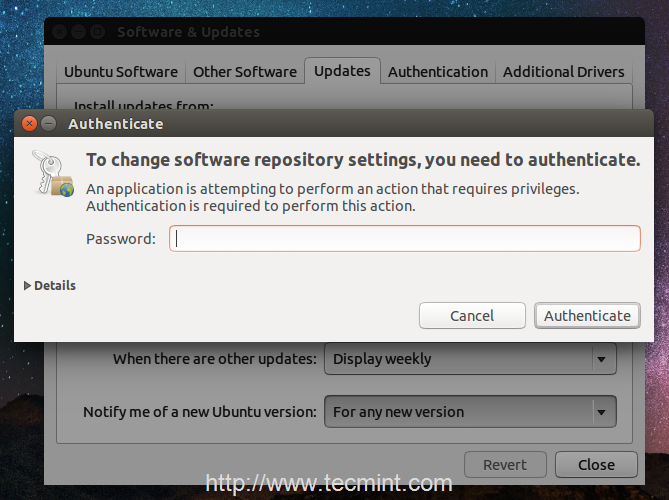 It’ll prompt you to enter your password before making any changes to software repository settings.